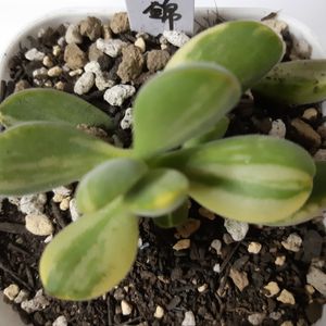 ずっと前に道の駅で買った(斑が地味な)ロゲルシー錦。 葉縁(ようえん)がピンクになって妖艶です💕 (強引なダジャレです🙇🏻♀️) 今日は(やっと)多肉の植え替え作業をしました。 植え替え待ちがあまりにも多くて、秋に買ったこの子は この春には植え替えの順番は回ってこないような気がしています💦