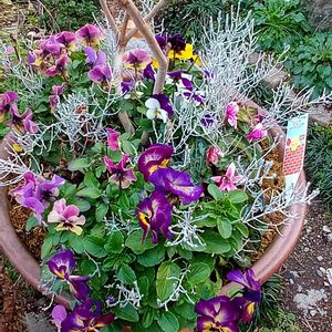 ギャザリングの寄せ植え マイクロ系ビオラが1回咲き終り 2回目がやっと咲いてきました。 おはようございますm(_ _)m 今日は☁マークです。