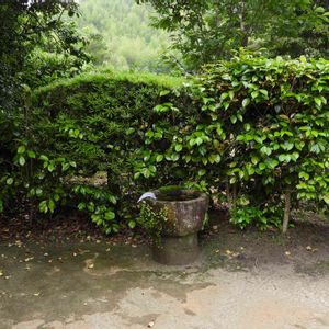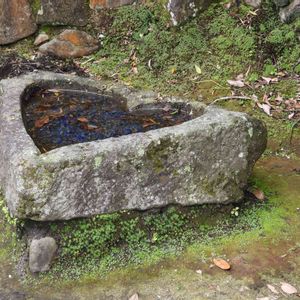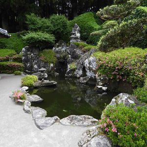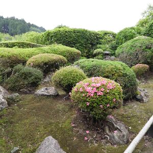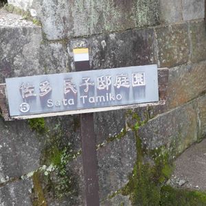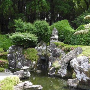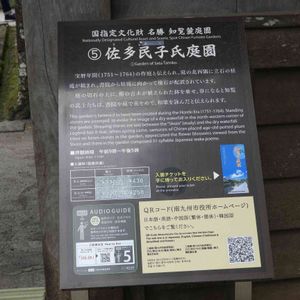 国指定文化財 名勝 知覽麓庭園 佐多民子氏庭園 宝暦年間(1751~1764) の作庭と伝えられ、庭の北西隅に立石の枯 滝が組まれ、書院から枯滝に向かって飛石が配置されています。 庭の切石の上に、梅の古木が植えられた鉢を乗せ、春になると知覧 の武士たちは、 書院や庭で花をめで、和歌を詠んだと伝えられます。