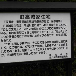 旧高城家住宅 【国選定 重要伝統的建造物群保存地区・保存建物】 旧高城家住宅は、 明治以前に建てられた武家住宅であり、 「おとこ玄関」と「おんな玄関」の二つがある特徴をもって いる。他の知覧型ニッ屋と同様に 「おもて」 と 「なかえ」の 二つの屋根の間に小棟を置いたタイプのもので、 知覧だけに みられる。 二つの本棟と小棟の形、 そこにできる屋根の造形は実に美 しく、 この構造は、 知覧大工の創造力と技術によって完成さ れたものである。昭和に入り 「なかえ」部分は失われていた が、平成6年3月に復元したものである。 南九州市 南九州市教育委員会