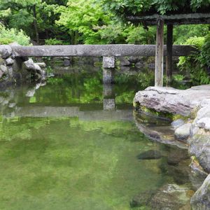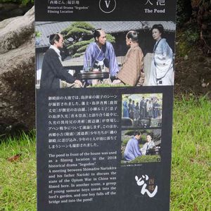 2018年大河ドラマ 「西郷どん」 撮影地 大池 御殿前の大池では、 島津家の親子のシーン が撮影されました。 藩主島津斉興[鹿賀 丈史] が側室のお由羅、[小柳ルミ子] 息子 の島津久光 [青木崇高] と語り合う最中に、 久光の異母兄の斉彬 [渡辺謙] が登場し、 アヘン戦争について議論します。 このほか、 西郷小吉 (隆盛) [渡邉蒼] 少年たちが「磯の御殿」に忍び込み、 少年の1人が池に落ちて しまうシーンも撮影されました。
