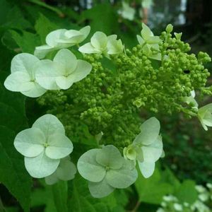 雨の日の日陰の一重のカシワバアジサイ🐸 実物はもっと白いです🐌 お出かけ先のお庭にて🌱