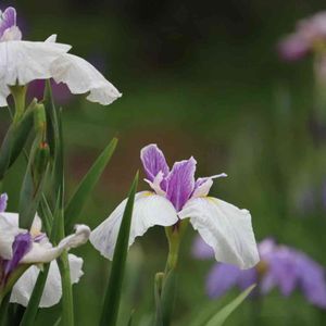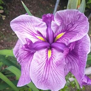 🌸花菖蒲🌸さん 江戸系 深窓佳人(シンソウカジン) 白色の外花と内花の紫色がバランス良く際立って美しい姿です💠 外花被片は三枚で大きく垂れ下がり 白色で薄紫色地の筋があり縮緬状の縁 内花被 紫色地で濃紫色の筋
