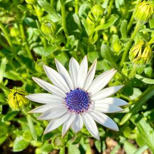 2年目オステオスペルマム第1号咲きました! 白に絶妙なブルーの芯が美しいです。 花芽もいっぱいで華やかになりそうです。