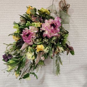 去年のドライフラワー キッチンに飾っていた3束を解体して 綺麗なお花だけを集めて作り直したスワッグです