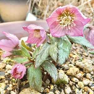 今夜からの寒波に備えてお迎えしたばかりでまだ植えていないクリスマスローズさん達と薔薇の小苗を玄関の土間に避難しました💦 去年だったかなぁ〜の寒波でいくつかダメにしてしまった苦い思い出があるので今度は二の舞にならないように😅 過保護かなぁ😂 2枚めは少し前にお迎えしていた原種のクリスマスローズ チベタヌスの苗🥀 育てるのが難しいらしく、失敗しても悔いが残らないようにいちばんお安い2年生を3株お迎え 3株お迎えすればひとつぐらい残るでしょうと思って😉 開花まであと5年ぐらいかかるみたいです💧 気が遠くなりそう〜😂 こんなに小さな株なのに開花見込み株に比べるとかなりお安いとはいえ、それでも普通のお花に比べると全くお安くはなく💦 ダメにしてしまわないようにしないと💦💦 3枚めはやっと出てきた葉っぱ🌱 届いた時は土しかなかったのでどうやら成長しているようです😉 5年後、3株揃ってお花が見れると良いな🎵😆
