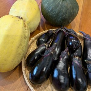 実家からのお裾分け〜 金糸瓜(そうめんカボチャ) かぼちゃ🎃 ツヤッツヤのなす🍆 我が家には無いお野菜たち ありがたいわぁ〜😍