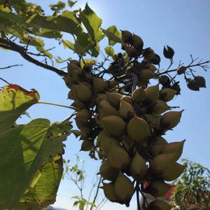 職場の裏の建物前に巨大な葉の植物が植えられていました。 高さは2階に届くくらいで、葉の大きさは長径が30cmを軽く超えるものもありました。 撮影日 2019.8.26 モンチッチさん、みーさんから桐の木とのコメントをいただきました。ありがとうございました。