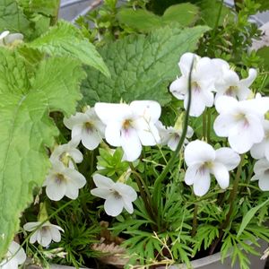 白いスミレ とにかく白いです 中心が少し黄色く 葉っぱ🌿は細目です。 名前が分かりません! 知人から分けて頂きました😃