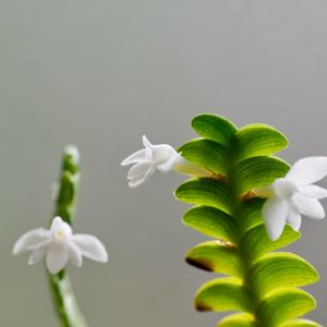 🌿アングレカム・ディスティカム🌿 パッと見、シダっぽい😅 ポツンと一輪咲いていました♪ 白花ってピント合わないわ‥💦
