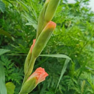 雨上がりに! 球根から植えたグラジオラス🌷 コーラルピンクがきれいです 水滴がキラキラしていて、満足😊 草とりがおろそかになっているのは、目をつぶろう🙈