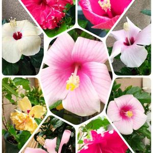 今朝のハイビスカス 沢山咲きました! 右側上より ヘップバーンレッド ヘップバーンホワイト ヘップバーンピンク 左側上より ハニーイエロー ホワイトバタフライ リリアン
