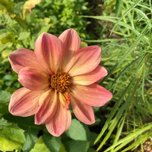 💮ダリヤ💮 小さめのダリヤ。 秋らしいオレンジ色が、可愛く咲きました💕 葉っぱ虫食いなんだけど、どんな虫か? 昼見ても、夜見ても、発見できず。 いなくなったのならいいけど。 いっぱい咲いてね~🥰