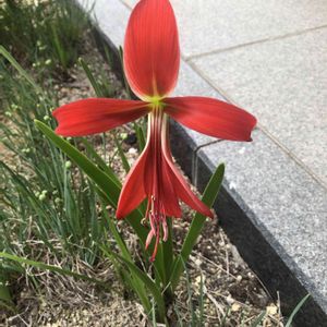 ♡つばめ水仙(スプレケリア)♡ 先週突然①のような不明な茎が芽を出しビックリ‼️ 翌日②のような蕾を開きかけ 昨日 お花が咲きました。 あ〜そういえばツバメ水仙の球根を植えてました🤭 1球だけのツバメ水仙 面白いフォルム、シベが下がって先が金色、小さな葉っぱが下に見えますか? お花のわりに小さな葉っぱ🍃で気がつきませんでした😅 🏷真っ赤な火曜日 🏷初めての花♡ 🏷ワクワクげ止まらない 🏷ほんわか❤️ほんのり