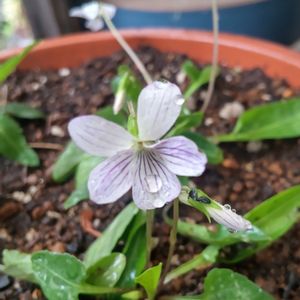庭の石が沢山敷いてある所にひっそりと咲いていたスミレ。 なんとか引き抜いて鉢に植え替えてみました。 アリアケスミレでしょうか? 白い可愛らしいスミレです。