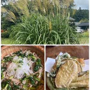 9月23日にお蕎麦を食べに行ったら、庭にススキが… 天ぷら盛り合わせとニラ・大根蕎麦です😄
