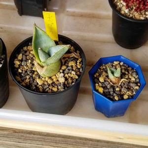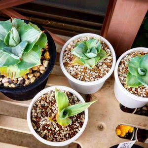 アガベ 王妃雷神白中斑 カキ仔も根付いて順調かな(*´ω`*) それにしても、そっくりな子もいれば、似てない子も… どんな風に生長するのか楽しみだな٩(๑´0`๑)۶