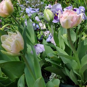 今日のお花 🌷チューリップ🌷 一昨年 春の我が家の小さな庭です 色とりどりの🌷チューリップが咲きました🎶💛🧡🤍💗 お気に入りの この淡いピンクの八重咲き、昨年消えてしまって〜