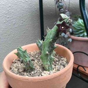 部屋に入ったら「なんか臭い❗️」 紫竜角の2つ目の花が咲いていました。原因はこの花😣 臭かったので早々にベランダに出しました😓 小さくても臭いです(ノДT)アゥゥ