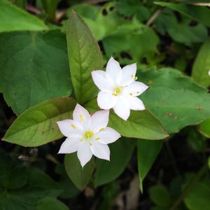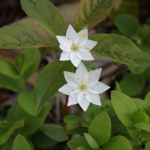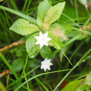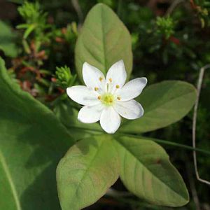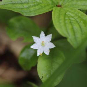 褄取草 サクラソウ科ツマトリソウ属 6月〜8月 亜高山の草地や林縁に生える小さな多年草。通常7枚だが6〜8枚の花びらをつける。 葉は茎に互生し、茎の上部に輪生状につく。葉の形は広披針形で、先が尖る。 大半は白色だが、希に、花弁の先きを淡い紅色に染めるものがあり、鎧(よろい)を縁取る「褄取威(つまとりおどし)」に似ていることから、その名が付いたという。