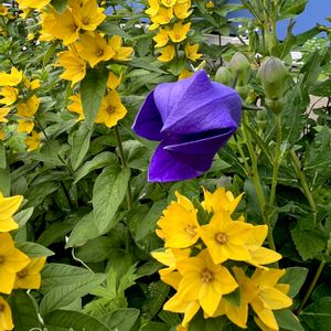 リシマキアが満開ᐠ( ᐢᐢ )ᐟ その中に 怪しげなフードを被った魔女のような桔梗が👀💕︎︎ ちっちゃな魔女が ビビビビビ〜って魔法をかけようと両手を前に出してる様に見えました🎶🎶🎶