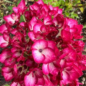 私の庭には ドナさん発のアジサイがたくさん居ます(。•ᴗ•。)♡ この子は『花もよう』 ネットで見る他の『花もよう』より赤い部分が多め♥️ 梅雨の庭に艶やかに咲いて 室内からでもよ〜く見えます( 'ω' و)و "