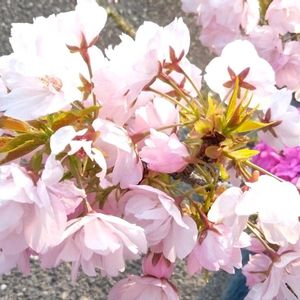 今日のお花 ナス 茄子 今夜の一品は 麻婆茄子 です サクラ 桜 低い位置で撮り易かった☺️ 濃い色のお花は 芝桜 です