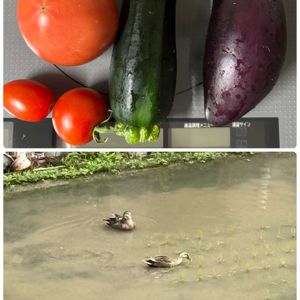稲が🌾植えてある中にカルガモが ついばんでいました 畑の初なりを収穫 何作ろう〜😋