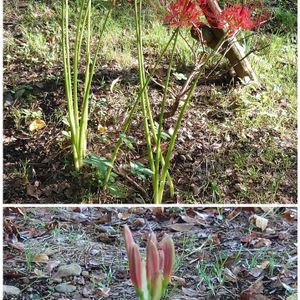 【1枚目】 紅白そろいました🙌 ヒガンバナって、あの長くて細ーい茎でよく倒れないですね👀 で、花の時期には葉っぱがない😱 ふしぎー🤔(農業試験場内にて) 【2・3枚目】 急に大家族になっていました😮 しかも羽繕いしやすいいい場所を見つけましたね😀 ラッキーだったカモね🦆🤭