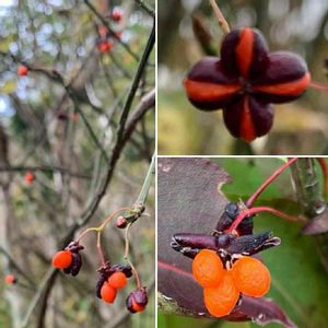 コマユミ ニシキギ科 右上の種がはじける前が 面白いです。 右下は中から種が出て来たところ。 妹picより
