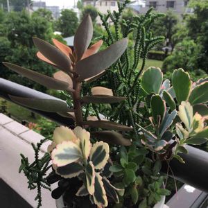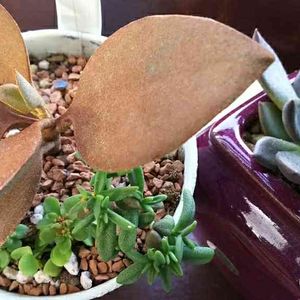 うちわ隊トリオ❗登場⤴⤴ カランコエ属 仙人の舞 左 唐印(デザートローズ) 中 江戸紫 右 黄門様もうちわ応援隊💦 多肉じゃないけど💦 💡黄門様おじぃちゃんだから、 うちわが重く顔色悪〰ぃ❗ 大丈夫かな?