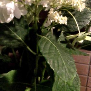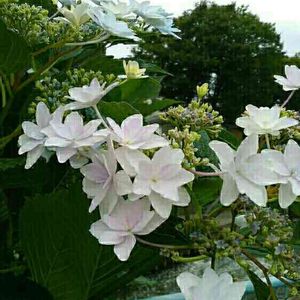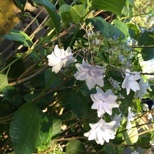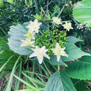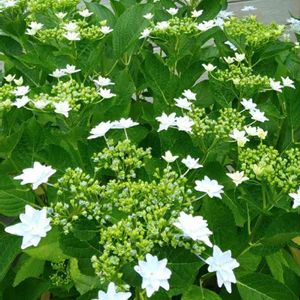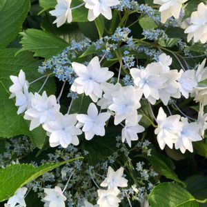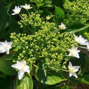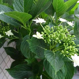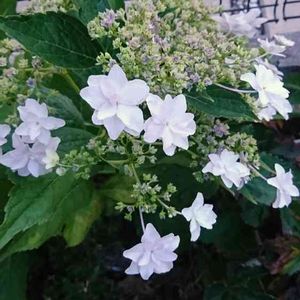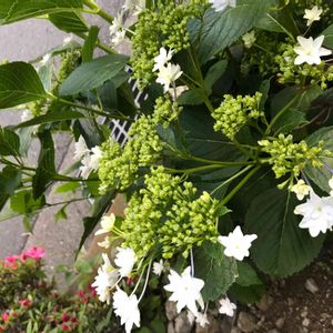 そごう横浜店の入り口側にあった植え込み、他の花はお疲れ気味でしたが、真っ白なヤマアジサイ?は、ひときわ元気に咲いていました。ヤマアジサイでいいのでしょうか?どなたか教えてください🙇♀️