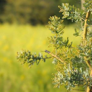 ミモザ 別名今日の花の ギンヨウアカシアかな? バックが菜の花 大神ファーム