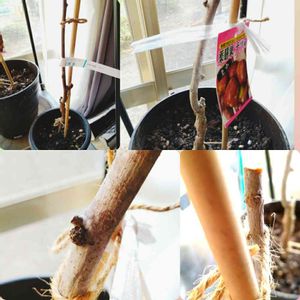 こちらは家の縁側の窓辺にいる 去年の12月にお迎えした ちまっとした根っこが1~2本しかない 棗の中華大龍(左側) 植えてから負担を減らすために 長さを18センチくらいにカット。 まだ幹の色は悪くないですが 皺が寄りビミョー😓 無事に根が出るまで半日陰で管理。 皇帝ナツメ(右側) 庭植えにしていたやつを 12月に鉢植えに植え替えしました! こっちも18センチくらいにカット。 根っこは充分あるので こちらは大丈夫でしょう☺️ まだ新芽の動きがみられませんが 5月までには動き出してくれたらと 願って観察してます😅