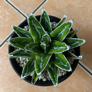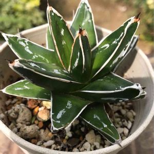 またまたアガベ😆 輝山というらしい。班が入って美しいですが、緑、黄緑のコントラストがもう少しはっきり出てきたらいいな。
