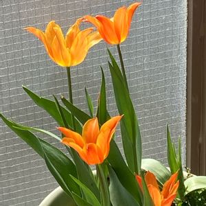 【1枚目】4月3日にも投稿したキンギョソウのプランターに仕込んだチューリップ・バレリーナが咲き始めました😆 片手をあげて「よっ!」と挨拶してくれましたよ🤭 色合いは予想通りバッチリです!😁👍 【2枚目】が、しかーし、横から見るとキンギョソウに埋もれがちー💦 かろうじて顔が出てる、かな?😅 まだ一つだけなので、他の花が咲きそろう頃にはもう少し伸びてくれると信じてます🥹🙏 【3枚目】今季イチオシの班入り葉のチューリップ・ハッピーアップスターも蕾が膨らんできて、期待も膨らむばかり!😆💕 八重花なので蕾が太っちょで可愛いです🥰 【4枚目】こちらのピンクの2色咲きはトンプーシュ。ピンク✕白かなと思ってましたが、ピンク✕クリーム色ですね。優しくて甘い色合いでとっても可愛らしいです🥰💕 咲き始めはクリーム色が強くエレガントレディみたいな色合いでしたが、咲き進むにつれてどんどんピンク色が濃くなってきました。 真ん中の鉢は深紅のフリンジ咲きのベルサーチで、まだ蕾です。以前育てた時はベロニカ・オックスフォードブルーと同時期に咲いてくれて、深紅とブルーの素晴らしい対比を楽しみましたが、今年は遅いのかな?🤔 【5枚目】こちらはクリームイエローのシークレットパフューム。早咲き品種で草丈低めの小ぶりな子です。外側がクリームイエローで、開くとレモンイエローかな。優しいお色です😊 3月27日には3輪くらい咲いていたので、今季はお天気が悪いせいか花もちがいいです👍 他のチューリップもお天気が悪いから長持ちしそうです😁 今季のチューリップの足元には白のアリッサムとビオラを植えて白い絨毯を目指しましたが、なかなかうまく行きました😆👍 昨季は忘れな草を植えてスカイブルーの絨毯を目指したんですが、どこで間違ったのか矮性ではなく高性の忘れな草の種だったみたいで、すっごい伸びてしまったので咲く前にカットしたという大失敗でした🤣 スカイブルーの絨毯は諦めきれないので、またいつかリベンジしたいと思ってます😤💪💪💪