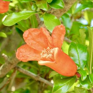 今日のお花の『ザクロ』でしょうか 庭木の下方に2つだけ咲いていました。 今まで、まったく気がつかなくて💦 夫に聞いたところ 「たしか昔、ザクロがあったはずだけど、どんな花かは知らん」と😅 綺麗なお花で、見つけてちょっと嬉しかったです❤️