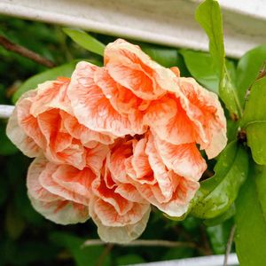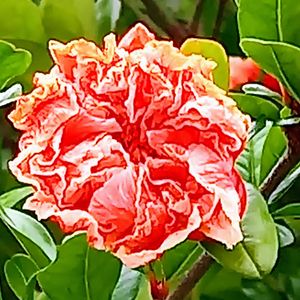 柘榴の花 一昨日に見つけた柘榴の花、今日の午前中に撮りなおしました。どうでしょう? ユーザーさんに、「花柘榴」と呼ばれると教えてもらいました。「八重柘榴」とも。 地中海沿岸から北西インド原産です。ザクロ科ザクロ属の常緑高小木で、普通は結実しないそうです。 あの酸っぱい柘榴の果実は出来ません🤭