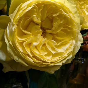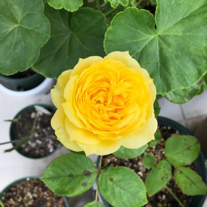 今日の花 黄色のバラ 💛庭の中央で1番花数多い ティーチングジョージァはリッチイエローの深みあるイエローの美しいカップ咲き 💛3枚目は名前が分から無い真黄色のバラ 🧡杏色のアブラハムダービー 🤍アイボリーのクレアオースチン