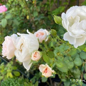 夏バラ🌹 ① 挿し木のデスデモーナ たくさん咲きます🤗 ②③親株のデスデモーナ 2階ベランダで咲いています💓 ④ 和バラ葵ちゃんも小花でたくさん咲きます🌹🌿 ⑤ 白とピンクのアイスバーグ ポワンと咲きますが可愛い💓 夏バラ咲かせる派〜ヾノ≧∀≦)イエイエ! 分かんないし 可愛いし 咲かせています🤗 9月10日過ぎに夏剪定します😆