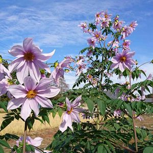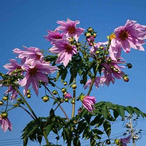 おはようございます😄… 庭の皇帝ダリアさんです😉… やっと咲き始めました🤤~💕 今年 初めて育ててますが 秋晴れの空にピンクの花は素敵だろうなって想像してましたが やっぱり素敵でした😋…