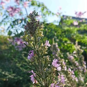 おはようございます😄… my花壇のローズマリーさん 小さな花が可愛いいです😋… 背景に皇帝ダリアさん… やっぱり植物って いいなです🤗💕…