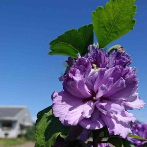 おはようございます😄… 秋晴れの真っ青な空と 庭のムクゲ(紫玉)さんです😉… 清々しいです🤗💕…