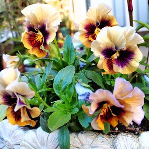 パンジー マシェリマダム ふんわり優しいフリルでシックな色のパンジーは寄せ植えにしました(左端にリシマキア ボージョレ右端にナデシコ)