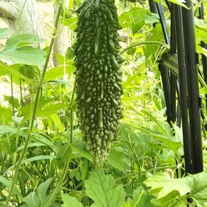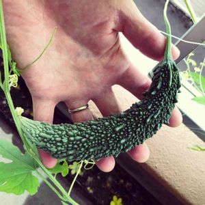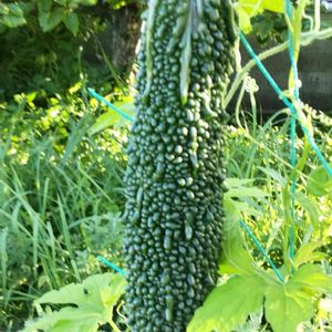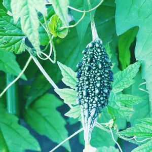 畑の見回り 今夜のおかず みーつけた!😄 ゴーヤのカーテンの後ろへ回ったら大きなのがありました 初収穫です😊
