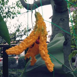 パッカーン! 種の為に残したゴーヤ。昨日こうなりまして 赤い種が見えました。ハロウィン🎃の替わり?
