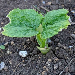 昨年のゴーヤの種を使って水に漬けたり、ポットに植えたりしてるけど、🌱が出ません! なのに、、畑でこんな🌱を発見!これってゴーヤ?🤔
