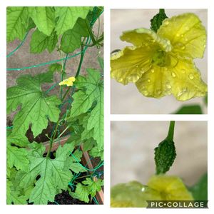 遅いけど、苦瓜の花咲いた〜(*´꒳`*) 食べたゴーヤから発芽して沢山葉っぱつけて、開花♫ チビっこいゴーヤが花の後ろに見える。また食べるんだー😋大きくなーれ!