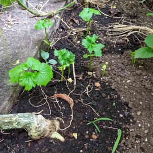 ゴーヤ! そろそろ畑を片付けようと思っているのですが、、 根元に、、新芽を発見! こぼれ種から芽をだしてる。 育てたら、秋に実るかな?