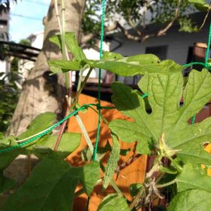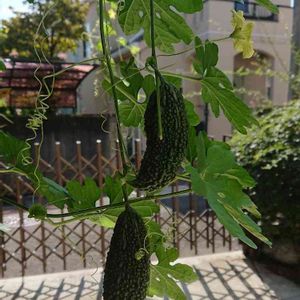 (。・ω・)ノ゙ コンチャ 椿の木に這わせてるゴーヤを見てたら結構たくさん実が付いてます(⁎˃ᴗ˂⁎)